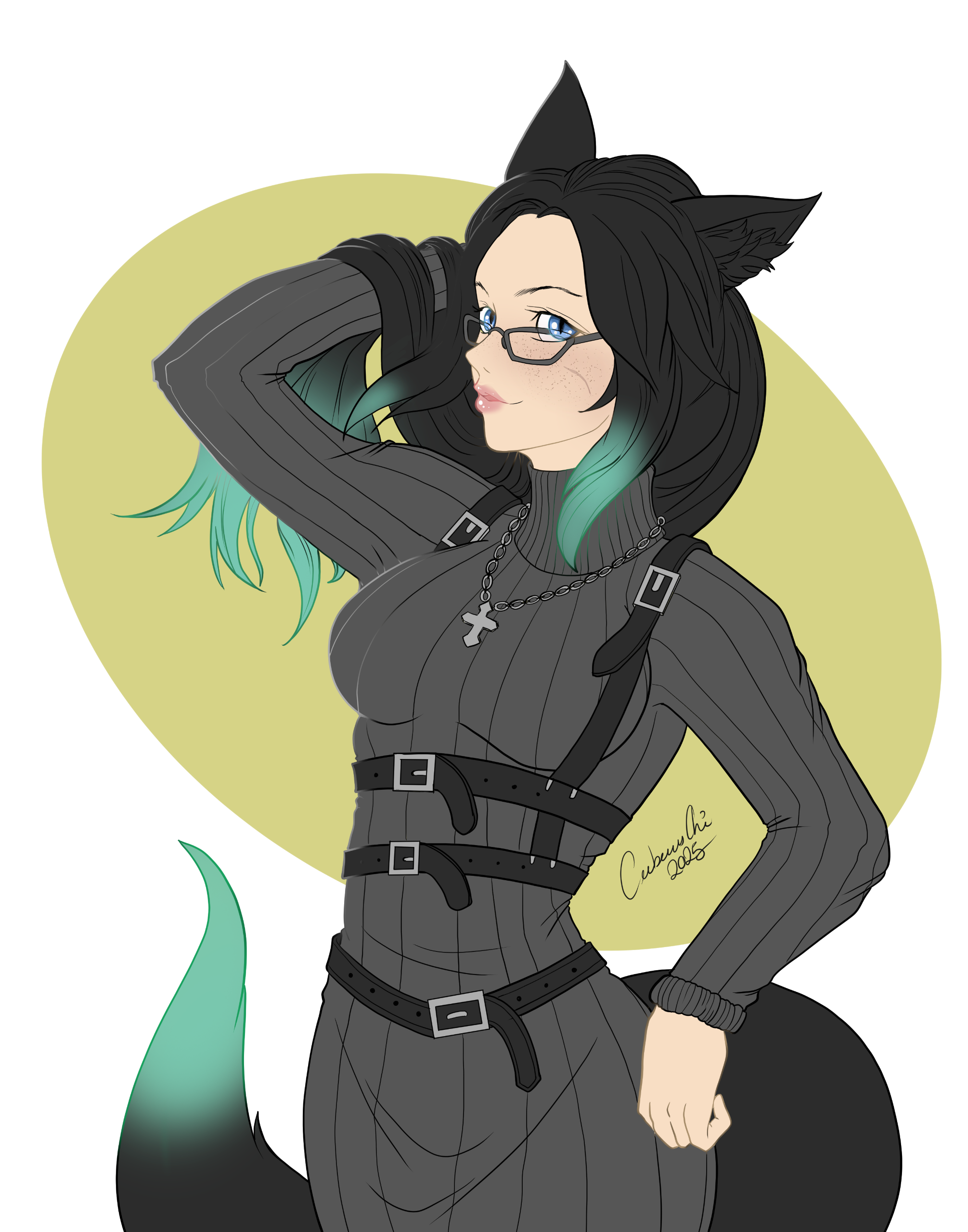 Typical Attire: Bridget loves the color black. Her hair is black, her fur is black and her clothing is black. She seldom wears anything but and when she does incorporate color into her wardrobe, she often includes flowers. Her style would be considered more modern than traditional, if not a little gothy.